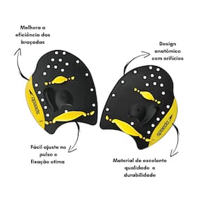 Design anatômico: Com orifícios estrategicamente posicionados para otimizar o controle da resistência da água. Apoio ergonômico para o polegar: Proporciona mais conforto e estabilidade. Tiras de silicone ajustáveis: Garantem maior conforto e segurança durante o uso. Aprimora a técnica: Melhora a eficiência das braçadas e aumenta a força muscular. Segurança: Reduz o risco de lesões por sobrecarga. Leve e durável: Flutuante na água, com material resistente.