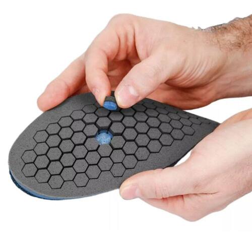 A palmilha mosaico oferece um alívio de pressão personalizado a cada usuário pois incômodos ou ferimentos na região plantar podem ser imediatamente aliviados, basta retirar pinos adesivos removíveis que ficam na parte inferior da palmilha.