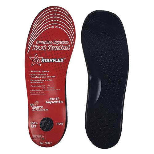 A Palmilha Foot Comfort da Starflex foi desenvolvida para auxiliar na absorção do impacto gerado pelo corpo sobre os calcanhares, tornozelos e pés. O gel tem um propósito essencial na palmilha, pois age como uma mola, amenizando o impacto gerado pelo corpo sobre os pés. O tecido inferior é macio e possui secagem rápida, facilitando a higienização. Para um melhor ajuste nos calçados, a palmilha pode ser facilmente recortada para se ajustar ao tamanho desejado, atendendo dos números 36 ao 44.