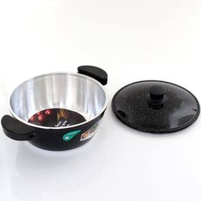 Panela 18cm Preto Resistente Gulê Em Alumínio 1,5 Litros - Dica do chefe. Após o uso caso surja manchas no interior da tampa ou da panela, basta ferver água com limão e vinagre branco para a remoção.