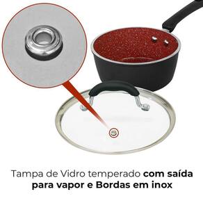 É produzida em alumínio preto fosco e revestimento cerâmico na cor vermelha marble, com a tecnologia Pro Ceramic Premium com classificação A do Inmetro, não grudam, são mais fáceis de limpar, mais saudáveis, pois necessitam de menos óleo para o cozimento e livres de metais pesados.