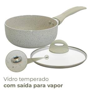 É produzida em alumínio na cor vanilla com revestimento cerâmico marble classificação A do Inmetro, não gruda, é mais fácil de limpar e mais saudável, pois necessita de menos óleo para o cozimento e é livre de metais pesados.
