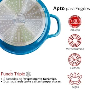 Suporta altas temperaturas, pode ir do fogão convencional e de indução e direto à mesa.Pode ir ao Forno.Em alumínio fundido e revestimento antiaderente de cerâmica, é mais resistente e reduz o uso do óleo nos seus preparos, além da sua tampa pinga gotas que auxilia no uso e na hora de servir. RecomendaçõesAntes da utilização lavar com agua morna utilizando sabão neutro enxugue e unte a parte interna com oleo e leve ao fogo baixo até que aqueça. Deixe esfriar ,lave novamente e sua panela esta pronta para usar.Use fogo baixo e evite de lavar a panela ainda quente.Não utilize utensilios metalicos e produtos abrasivos.Não se recomenda o uso na maquina de lavar.Não coloque no micro-ondas, geladeira ou freezer.