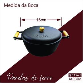 Panela Caçarola De Ferro Com Alça de Madeira Com Tampa 16cm Ideal para Arroz, frango, feijão e etc. A panela de ferro Casa e Jardim apresenta uma grande versatilidade onde elas fornecem suplementação de ferro para o organismo, não liberam toxinas nos alimentos. Tendo uma resistência duradoura cozinhando os alimentos por muito tempo. Todas as panelas de ferro do modelo caçarola podem ser utilizadas em todos os tipos de fogão a gás, a lenha, elétrico e também em cooktop de indução. Material: Ferro Fundido. Pegada: Duas alças de madeira : 90 dias contra defeito de fabricação. Acompanha: Tampa de ferro. Medida da Boca: 16cm Litros: 1,2 litros Nós da Casa E jardim Comércio trabalhamos com produtos de alta qualidade em ferro fundido, Como Fornos de ferro, panelas de ferro mineira, chapas de fogão a lenha, frigideira de ferro Casa e Jardim, chapa bifeteira de ferro, Fogareiro Ferro Fundido A Alcool Rechaud, calderão de ferro, calderão de bruxa, Rechaud de ferro, Chapa de ferro Casa e Jardim para porções, panelas de ferro, churrasqueiras a bafo toda linha doméstica para lhe atender. Marca: Não Informado