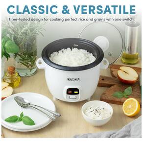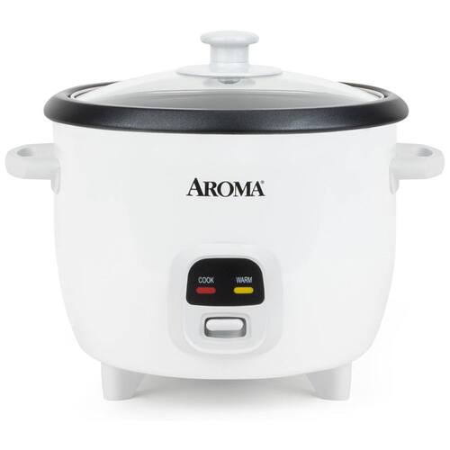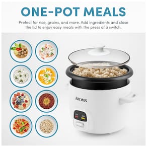 Panela de arroz Aroma com capacidade de 1,5 litros, cozinha até 6 xícaras de arroz cozido, possui função manter aquecido, panela antiaderente removível e componentes inclusos como copo medidor e espátula.Lâmpada piloto