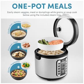 Marca: AROMA Componentes Incluídos: Bandeja de vapor, Copo medidor de arroz, Espátula para servir Nome do Modelo: Panela de Arroz, Multicooker e sistema de vaporização Número do Modelo: ARC-1020SB Fabricante: Aroma Housewares UPC: 021241710206 Fonte de Energia: Elétrica com fio Características Especiais: Programável Potência: 1550 watts Voltagem: 110 Volts Cor: Prata Capacidade: 5 Litros (aproximadamente 20 xícaras cozidas) Dimensões do Produto (D x L x A): 29,2 cm de profundidade x 28,5 cm de largura x 27,9 cm de altura Peso do Produto: 2,7 kg Instruções de Cuidados com o Produto: Lavar à mão Material: Alumínio Marca: Não Informado