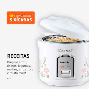 Capacidade para 5 xícaras: Faz até 5 xícaras de arroz e vários tipos de alimentos doces e salgados como risoto, sopas, carnes e legumes; Válvula de saída de vapor: Libera o excesso de vapor durante o preparo, proporcionando um cozimento perfeito; Preparo saudável: Acompanha cesto cozi-vapor para cozinhar legumes e verduras no vapor, preservando as suas vitaminas; Praticidade e limpeza: Coletor de Vapor para recolher a água condensada durante o funcionamento do produto. Cuba com revestimento antiaderente que facilita a limpeza; Acessórios: Acompanham colher, copo medidor e livro de receitas (incluído no manual); Informações adicionais: Lâmpadas-piloto que indicam o funcionamento (luz vermelha) e o aquecimento (luz verde) do produto. Uso residencial. 400W de potência.