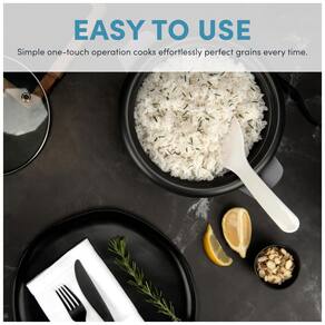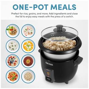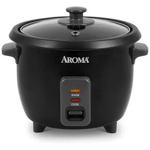 Panela de arroz Aroma Housewares com capacidade de 1,5L (6 xícaras cozidas), função manter aquecido, panela antiaderente removível, tampa de vidro e acessórios inclusos.Lâmpada piloto