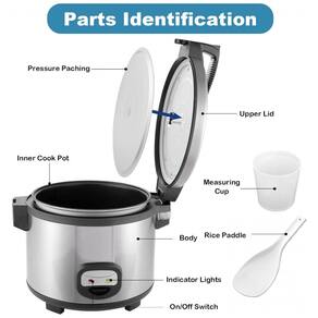 Construção de parede dupla durável Corpo durável e tampa de aço inoxidável resistente para uso contínuo. Esta panela elétrica de arroz possui construção de aço inoxidável de parede dupla isolada que manterá sua comida úmida e quente por horas. Operação fácil de usar O painel de controle simples nesta panela de arroz de restaurante facilita a operação de qualquer pessoa. A panela elétrica de arroz muda automaticamente para o modo manter quente após o término do cozimento. e fácil de limpar O pote interno de alumínio antiaderente é removível, fácil de limpar e possui marcações de linha de água visíveis para ajudar na medição precisa do líquido. O interruptor da fivela não é fácil de soltar, e confiável. A bandeja de recepção de vapor de água lateral recebe o excesso de condensado que flui para fora da drenagem, o que é fácil de limpar, e conveniente