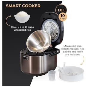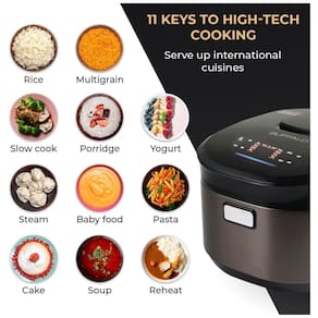 Panela de arroz elétrica com painel de controle de toque IMD, 11 funções de cozimento, microcontrolador inteligente, tecnologia anti-transbordamento, pote interno Buffalo Clad resistente à oxidação e antiaderente.Lâmpada piloto