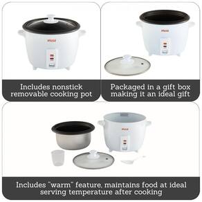 Recurso Quente mantém os alimentos em temperaturas perfeitas para servir após o cozimento. Inclui tampa de vidro temperado para monitorar o cozimento e luzes indicadoras de cozimento e aquecimento. Panela removível antiaderente ideal para arroz, aveia, ensopado, jambalaya e grãos. Inclui colher para servir e copo medidor. Ideal para pequenas cozinhas, dormitórios universitários, trailers e trailers.Lâmpada piloto