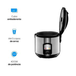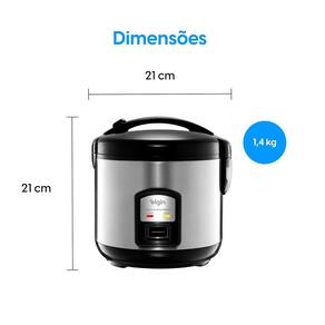 Para facilitar ainda mais, a panela acompanha colher, copo medidor e bandeja para preparar alimentos no vapor. Com uma potência de 700W, ela aquece rapidamente, agilizando o processo de preparo do arroz.
