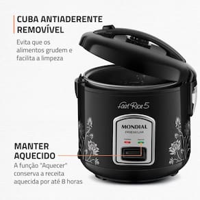 A Panela de Arroz Fast Rice 5 Premium Mondial garante um arroz saboroso e soltinho todos os dias. Com capacidade de 5 xícaras, prepara a quantidade certa para uma refeição em família. Possui cuba removível com revestimento antiaderente, cesto cozi vapor e conta com a função aquecer, deixando suas receitas sempre quentinhas. Acompanha colher que não risca a cuba e um copo medidor.
