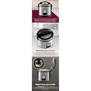 Capacidade para 5 xícaras de arroz Tigela com revestimento antiaderente Luzes indicadoras de funcionamento Faz diversos tipos de arroz Cozinha legumes e verduras Bandeja perfurada para cozinhar no vapor Acompanha colher e copo medidor Tampa vedada com alça, botão de travamento e saída de vapor Tampa com visor em vidro para acompanhar o preparo do alimento Coletor de água Cordão elétrico removível