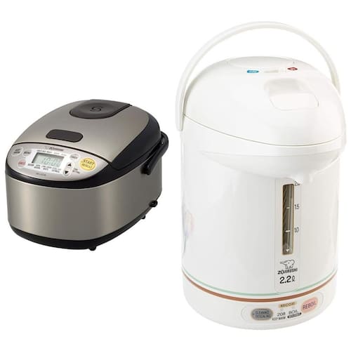 Panela de arroz elétrica Zojirushi Micom com capacidade de 3 xícaras (0,54 litro), aquecimento triplo, funções multifuncionais, timer e cabo retrátil. Acompanha panela elétrica Super Boiler Micom 2,2L com sistema de controle de temperatura e modo de descloração.Lâmpada piloto
