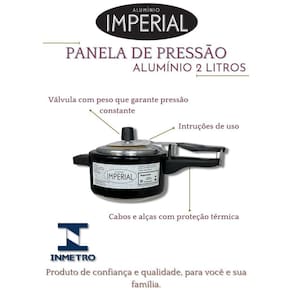 Panela de pressão 2 litros alumínio preta selo inmetro grossa resistente Com a panela de pressão alumínio da Alumínio Imperial você também adquire praticidade e segurança para você e sua família. Seus componentes passam por testes rigorosos e o produto acompanha selo de qualidade INMETRO. Benefícios: - A borracha altamente resistente impede que o ar escape e faça com que a panela perca a pressão interna. - A válvula impede que o limite de pressão seja excedido. - Possui trava de segurança. - Alumínio Informações Técnicas: - Litragem: 2,0L. Marca: Alumínio Imperial