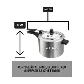 Design Funcional: Seu design é projetado para oferecer praticidade durante o uso, com alças ergonômicas que facilitam o manuseio. Com todas essas características, a panela de pressão de 4,5 litros em alumínio e acabamento polido é uma excelente opção para quem busca praticidade, segurança e sustentabilidade em um único produto.