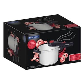 Panela de pressão em aço inox, com fundo triplo, cabo e alça de baquelite. Pode ser utilizada nos fogões: elétrico, gás, indução e vitrocerâmica.