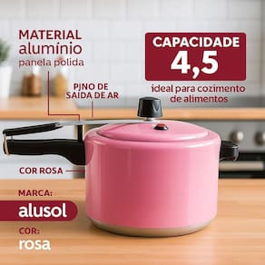 Panela Alusol de 4,5 Polida Rosa Panela Alusol 4,5L Rosa - Segurança e Qualidade Certificada Prepare suas receitas favoritas com muito mais praticidade e tranquilidade A Panela Alusol 4,5L na cor vermelha une design moderno, resistência e segurança, sendo ideal para o dia a dia da sua cozinha. Registro no INMETRO nº 4296/2018 - de qualidade e conformidade com as normas de segurança. Válvula de segurança + pino com saída de ar - mais proteção no uso diário. Capacidade de 4,5 litros - tamanho perfeito para preparar refeições práticas e saborosas. Estrutura em alumínio de alta qualidade com acabamento durável. A escolha certa para quem busca uma panela segura, prática e certificada Marca: Não Informado