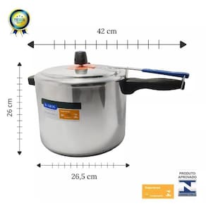 Marca: Ramos Araraquara Linha Comercial: Pressionella Produto: Panela de Pressão No de Peças: 1 Peça Material: Alumínio - Baquelite Anti-Térmico Diâmetro: 2,25 cm Espessura: 2 mm Capacidade: 10 litros. Comprimento: 42 cm. Largura: 26,5 cm. Altura: 26 cm. Peso: 2,3 kg.