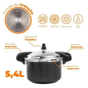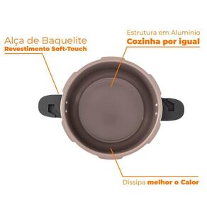 A panela de pressão Ceramiclife conta com estrutura de alumínio com revestimento cerâmico que cozinha os alimentos por igual e mais rápido, dissipando melhor o calor, proporcionando um maior aproveitamento de nutrientes dos alimentos agora com exclusivo fundo de indução, que funciona em todos os tipos de fogões, para você passar menos tempo cozinhando e ter mais segurança durante os preparos. Além disso, suas paredes externas possuem pintura na cor preta fosca trazendo mais sofisticação para a sua cozinha. Seu cabo e alça de baquelite com revestimento soft touch proporcionam mais conforto e melhor manuseio, já que possuem toque macio e não esquentam. Possui 2 anos de garantia e 4 dispositivos de segurança (uma trava, duas válvulas de trabalho e um escape de segurança).
