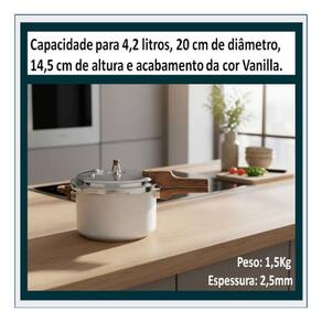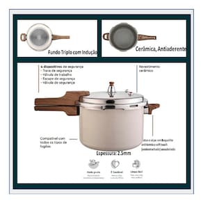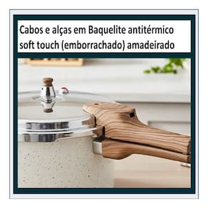 Panela de Pressão Mimo Style PressCook 4,2L – Grafito A Panela de Pressão Mimo Style PressCook 4,2 litros é produzida em alumínio com espessura de 2,5 mm, revestimento cerâmico antiaderente e fundo de indução, garantindo preparo rápido e uniforme. Possui quatro sistemas de segurança, cabo baquelite antitérmico soft touch amadeirado e design sofisticado na cor Grafito. Compatível com fogões a gás, elétricos, vitrocerâmicos e de indução. Medidas: - Diâmetro: 20 cm - Altura: 14 cm Características: - Revestimento cerâmico antiaderente: fácil limpeza e alimentos não grudam - Capacidade de 4,2 litros: ideal para famílias e receitas maiores - Fundo para indução: eficiência energética e cozimento rápido - Trava de segurança e válvulas reforçadas: uso seguro e confiável - Cabo ergonômico soft touch amadeirado: firmeza e conforto no manuseio Cuidados de uso: - Não levar ao micro-ondas, forno ou lava-louças - Realizar a cura do revestimento antes do primeiro uso - Lavar à mão com esponja macia e sabão neutro - Evitar choques térmicos e materiais abrasivos
