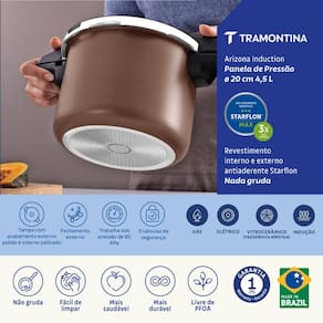 A panela de pressão Tramontina Arizona Induction em alumínio com revestimento interno e externo em antiaderente Starflon Max 20 centímetros de diâmetro 4,5 litros é perfeita para o dia a dia. Com 20 cm de diâmetro e capacidade de 4,5 litros, oferece cozimento rápido e uniforme graças ao corpo em alumínio de 3,2 mm. Seu fundo de indução amplia a versatilidade, permitindo o uso em diferentes tipos de fogão, incluindo os por indução. A tampa em alumínio polido e as alças em baquelite antitérmico garantem segurança e conforto no manuseio. Praticidade e eficiência para facilitar sua rotina na cozinha.