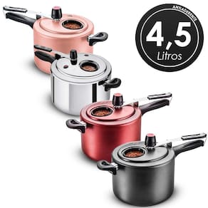 PANELA DE PRESSAO COM VISOR DE VIDRO 4,5LT 6023CARACTERÍSTICAS:- A Panela de Pressão com Visor MTA, adicionará um toque de requinte a sua cozinha graças ao visor de vidro inquebrável em uso- permitindo que o cozimento do alimento seja acompanhado através dele- Não somente o nível de água dentro da panela poderá ser supervisionado, mas, em muitos casos, será possível conferir se o alimento já terminou de cozinhar- O visor é removível para a limpeza, mas não precisar se preocupar em como fazer isso, pois receberá o manual completo com instruções- Seu revestimento Superflon MTA antiaderente composto por cinco camadas, facilitarão o manuseio e a limpeza da panela de pressãoESPECIFICAÇÕES:- Marca: MTA- Capacidade em Litros: 4,5- Material da tampa Alumínio com Visor de Vidro Temperado- Material do pegador: Plástico- Válvula de Segurança: Sim- Garantia: 3 MesesOPÇÕES DE CORES:ROSÉCEREJAGRAFITEALUMINIO POLIDO**IMAGEM MERAMENTE ILUSTRATIVA**