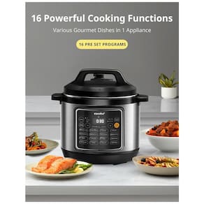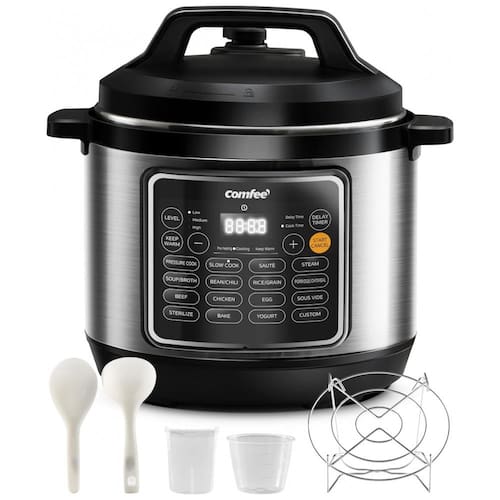 A Panela de Pressão COMFEE de 8 litros oferece 16 funções programáveis que atendem a todas as suas necessidades culinárias. Cozinhe pratos gourmet como carne, caldo, feijão, aveia, e muito mais, de forma prática e rápida. Cozinhe de maneira saudável com a panela revestida de cerâmica, livre de produtos químicos nocivos. O revestimento antiaderente facilita a limpeza e garante durabilidade. Para sua segurança, possui travamento de tampa, proteção contra bloqueio, controle automático de pressão e temperatura, além de proteção contra superaquecimento. Com capacidade para 8 litros ou 20 xícaras de arroz cozido, atende facilmente refeições para 6 a 8 pessoas. Acompanha 6 acessórios úteis: colher, concha, copo medidor, copo de condensação, suporte para cozimento a vapor e cabo de energia.