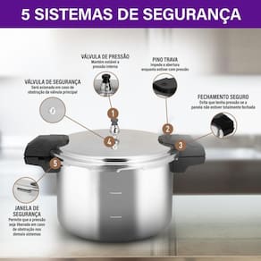 Asas ergonômicas Alumínio resistente Marcas de medidas Espessura de 1,9mm Tampa fácil de abrir e fechar Com 5 Sistemas de segurança Compatível com máquina de lavar louças Livre de PFOA e outras substâncias tóxicas Pode ser utilizada em fogão a gás, vitrocerâmico e elétrico exceto indução