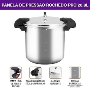 Panela de alta capacidade com 5 sistemas de segurança, tampa fácil de abrir, asas ergonômicas, marcas de medidas. Fabricada em alumínio resistente, livre de PFOA. Compatível com fogões a gás, vitrocerâmicos e elétricos (exceto indução). Possui garantia de 10 anos para o corpo metálico.Vendido e entregue por Olist Store