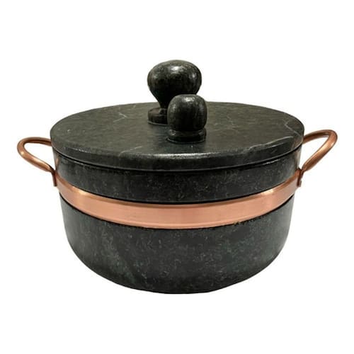 PANELAS DE PRESSÃO DE PEDRA SABÃO SÃO JOSÉ Panela de Pressão de Pedra Sabão com alça e contorno em cobre capacidade 4 litros- Diâmetro: 25 cm- Altura: 13 cm- Peso: 8 kg Matéria prima- Pedra Sabão e CobreQue tal reunir a família e amigos para compartilhar bons momentos acompanhados de deliciosas receitas!?As panelas de Pedra Sabão deixarão suas receitas ainda mais gostosas. Elas propagam o calor de forma uniforme e eficiente, cozinhando o alimento por igual e os mantem quente por mais tempo, mesmo após retirar do áveis e decorativas as panelas de Pedra Sabão levam charme e requinte para sua cozinha e mesa. Leve o sabor da comida mineira para sua casa!** Por se tratar de um produto natural e artesanal pode haver pequenas variações de coloração, traços, medidas ou capacidade em relação a descrição e fotos.** Os produtos de Pedra Sabão devem passar por um processo de cura, que sela e aumenta a resistência da pedra. O processo é simples e leva apenas alguns minutos. Enviaremos instruções de como curar seu produto. Com a cura a pedra escurece, ficando num tom próximo ao uso de pedra sabão tem sido cada vez mais comum em cozinhas de todo o . Inclusive, é uma febre entre chefes de cozinha e influencers da área de gastronomia. Além de dar mais sabor aos alimentos, proporciona muitos benefícios para a nossa saúde. Estudos recentes mostraram que, durante o processo de cozimento em utensílios de pedra sabão, há transmissão de nutrientes benéficos como o ferro, , cálcio e magnésio da panela para os ingestão de ferro contribui para aumento da nossa energia e disposição, além de prevenir o envelhecimento precoce, melhorar nossa concentração, reduzir o risco de doenças e fortalecer cabelo e á o auxilia no fortalecimento do nosso sistema imunológico e ajuda a acelerar o processo de cicatrização e afastar o surgimento de infecções e outras doenças, como o e alguns tipos de câ cálcio, por sua vez, é fundamental para a mineralização dos nossos ossos e dentes. Também é o principal agente responsável pela divisão , pela contração dos músculos, secreção de hormônios e coagulação sanguí magnésio é um mineral que desempenha um papel em mais de 300 reações enzimáticas em nosso organismo. Dentre as suas funções estão o auxílio na função muscular e nervosa, além de contribuir para regular nossa pressão sanguínea e fortalecer nosso sistema imunológico.