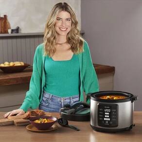 O recipiente interno é antiaderente e removível, o que facilita a limpeza. Além disso, a panela é silenciosa, tem um design moderno em inox escovado, resistente a marcas de dedo, e pode ser deixada exposta na bancada.