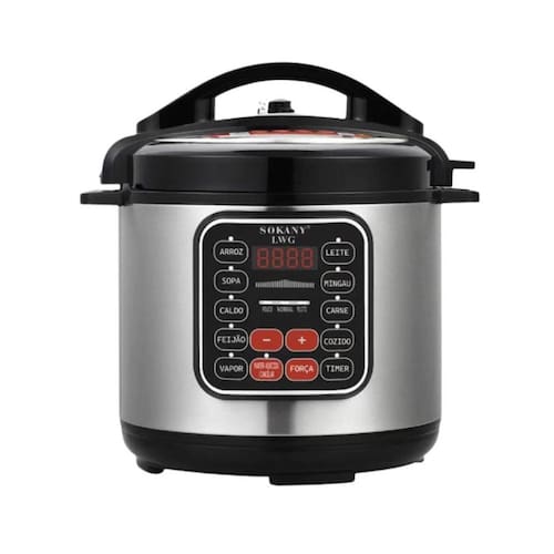 Design moderno em aço inox, painel digital com múltiplos programas pré-definidos, função manter aquecido, sistema de segurança avançado, trava automática na tampa, revestimento interno antiaderente, alças laterais.Lâmpada piloto