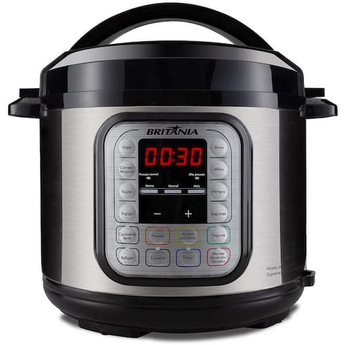 Panela de Pressão Elétrica Britânia Supreme Gold, 5 Litros, display digital, 11 programas de cozimento, função manter aquecido, timer programável até 24 horas, acabamento em aço inox, 9 sistemas de segurança.Lâmpada piloto