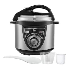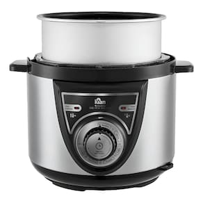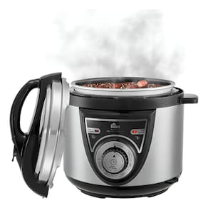 Panela de Pressão Elétrica Mecânica com corpo em aço inox, cuba antiaderente removível, painel mecânico com seletor de tempo, função aquecer automática, trava de segurança e válvula de pressão, alças laterais resistentes, tampa com alça superior, luz indicadora de funcionamento (cozinhar/aquecer), cabo elétrico removível.Acompanha copo