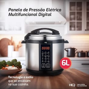 Panela de Pressão Elétrica HQ invista em refeições saudáveis e deliciosas sem abrir mão do sabor e da segurança. Mais tempo para o que realmente importa.