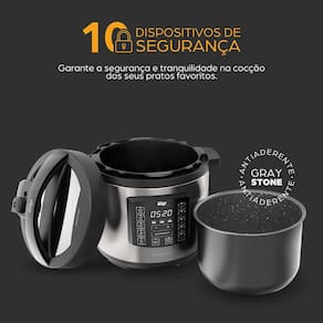 A Panela de Pressão Elétrica da WAP integra 10 dispositivos de segurança, garantindo tranquilidade durante o uso. Desde a proteção contra superaquecimento até a liberação controlada de pressão, proporcionando um cozimento seguro e descomplicado.