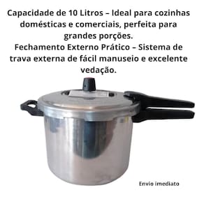 Panela Grande 10 Litros polida fechamento externo Panela Alumínio São José 10 Litros - Alumínio com Fechamento Externo Com capacidade generosa e estrutura robusta, a panela Alumínio São José de 10 litros com fechamento externo é a escolha ideal para quem busca praticidade, eficiência e segurança no preparo de grandes refeições. Principais características: Capacidade de 10 Litros - Ideal para cozinhas domésticas e comerciais, perfeita para grandes porções. Fechamento Externo Prático - Sistema de trava externa de fácil manuseio e excelente vedação. Alumínio Reforçado - Material leve, resistente e com alta condução de calor para cozimento uniforme. Redução de Tempo no Preparo - Pressurização eficiente que acelera o cozimento dos alimentos. Sistema de Segurança Múltiplo - Conta com válvula de trabalho, válvula de segurança e anel de vedação resistente. Cabos Reforçados e Ergonômicos - Proporcionam firmeza e segurança ao movimentar a panela. Design Funcional e Fácil de Limpar - Estrutura interna e externa que facilita a manutenção diária. Marca: Não Informado