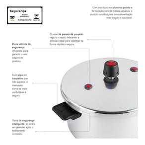 Feita em alumínio, nossa panela de pressão possui travas na tampa para vedação completa e duas válvulas adicionais para saída de pressão em caso de obstrução da válvula principal, o que proporciona maior segurança e tranquilidade para você durante o uso. Certificada pelo INMETRO, trabalha sob pressão de 80 Kpa, acima da média de outras panelas, fazendo com que o seu alimento cozinhe muito mais rápido!Seu modelo de fechamento externo facilita na hora de abrir e fechar, sem o risco de a tampa entrar em contato com o alimento. Além de tudo isso, possui um design lindo!