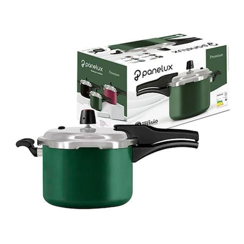 Panela De Pressão Premium 4,5 Litros Panelux Verde A panela de pressao Premium da Panelux na cor verde, vai abrilhantar as sua receitas. Possui revestimento interno e externo antiaderente, tem 4,5L de capacidade e fechamento externo.