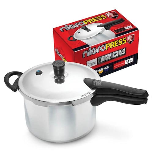 Todo mundo deseja ter em sua cozinha uma panela de pressão segura, resistente e eficiente, não é mesmo? a Panela de Pressão Press 4,5 Litros em Alumínio Nigro é tudo isso e muito mais. Possui quatro dispositivos de segurança, é equipada com anel de vedação em silicone, tornando -a mais resistente a altas temperaturas e proporcionando maior durabilidade. Conte com uma panela que, além de te oferecer muita praticidade, também pensa na sua segurança. A Panela de Pressão Press 4,5 Litros em Alumínio Nigro é esse produto.Com capacidade para 4,5 litros e produzida com alumínio, o produto oferece 4 sistemas de segurança para prevenir acidentes, sendo testada e aprovada pelo INMETRO.A Nigro Press permite o preparo de todos os seus pratos, como sopas, pudins, carnes, legumes e feijão, com muito mais qualidade e rapidez.Código de barras:7891232970024Referência:97002Marca: NigroComposição/Material:AlumínioDimensões aproximadas da embalagem (cm):20,5x37x23 cmPeso aproximado da embalagem do produto (kg):1.317 kg