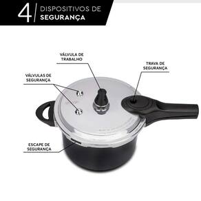 Com capacidade para 4,2 litros, a Panela de Pressão Pressure possui 4 dispositivos de segurança: uma trava, duas válvulas de trabalho e um escape de segurança. Isso garante que você possa cozinhar suas refeições com tranquilidade e sem preocupações.