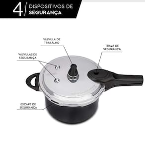 Especificações Técnicas: - Capacidade: 4,2 litros - Material: Alumínio - Compatível com fogões a gás, elétrico e vitrocerâmico - Possui 4 dispositivos de segurança: trava, duas válvulas de trabalho e escape de segurança - Cabo em banquelite que não esquenta durante o uso
