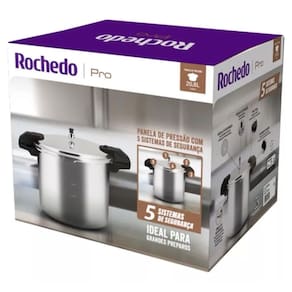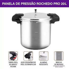 A Panela de Pressão de Alta Capacidade Pro 20 Litros Rochedo é perfeita para grandes preparos e possui 5 sistemas de segurança, garantindo segurança na cozinha profissional.
