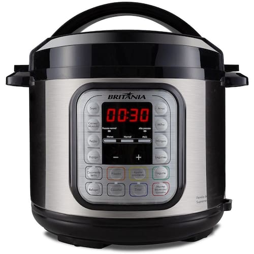Maior durabilidade e poder de antiaderente com revestimento Supreme Gold. Preparos e limpeza muito mais fáceis. Sirva os alimentos quentes e saborosos quando você quiser, isso porque a função Manter Aquecido mantém a temperatura por muito mais tempo. Além de trazer a função Manter Aquecido, que permite servir os alimentos aquecidos por muito mais tempo. E não se preocupe, os alimentos não irão grudar graças ao seu revestimento antiaderente Dura Mais. Possibilitando uma limpeza muito mais fácil. E para evitar qualquer acidente, a Panela de Pressão Britânia Multifuncional Digital BPP2PI conta com 9 sistemas de segurança, para que você cozinhe de forma muito mais tranquila e segura Prepara diversos tipos de alimentos, feijão carnes, arroz, canjica, legumes entre outros, Painel com controle digital e fácil acesso as funções; Visor digital para acompanhamento da programação e dos preparos; Possui 11 modos de cozimento pré-programado, permite iniciar o cozimento com apenas um toque;