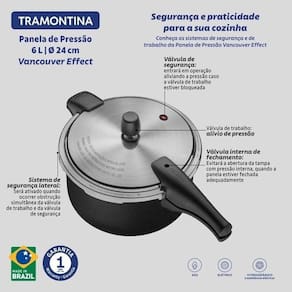 Mais , rapidez e praticidade no preparo das refeições. A panela de pressão Tramontina Vancouver Effect, com 24 cm de diâmetro e capacidade para 6 litros, é feita em alumínio com espessura de 3,2 mm e revestimento antiaderente Starflon Max, que evita que os alimentos grudem e facilita a limpeza. Com tampa de alumínio, acabamento polido por fora e satinado por dentro, ela oferece vedação eficiente, mantendo a pressão interna de forma segura. Os cabos e alças em baquelite antitérmico garantem conforto e proteção no manuseio. Na cor preta, com design moderno e robusto, é com fogões a gás, elétricos e vitrocerâmicos com resistência elétrica. Uma aliada indispensável para agilizar sua rotina na cozinha com confiança e desempenho.