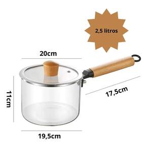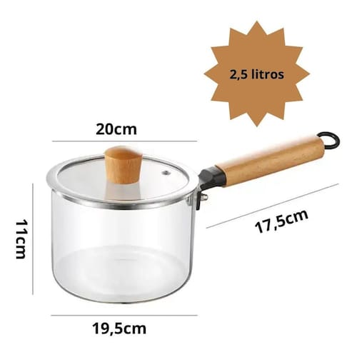 Descrição panela de vidro borossilicato 2,5 litros com tampa de vidro e cabo em madeira Importante: não recomendado o uso para fazer alimentos sem água. Produto é para ser utilizado sempre com água sopas, caldos, etc , não deve ser para fazer alimentos secos, fritura, etc pois pode quebrar/trincar a panela. Introduza a panela de vidro cabo madeira na sua cozinha e eleve a experiência culinária a outro nível com capacidade generosa de 2,5 litros, esta panela é confeccionada em vidro borossilicato, um material resistente ao fogo que suporta altas temperaturas, permitindo que seja Utilizado diretamente na chama. Imagine uma panela transparente com tampa que não só proporciona praticidade, mas também adiciona um toque de elegância à sua cozinha. Essa beleza funcional é ideal para o preparo de sopas, fervura de água e muito mais. Não apenas uma peça utilitária, mas uma adição estilosa à sua casa. Ao escolher a panela de vidro cabo madeira, você opta por um produto de alta qualidade, produzido com vidro borossilicato atóxico e ecologicamente correto, sendo totalmente livre de bpa, ftalatos, Cinza, metal e cádmio. Além disso, sua alta transparência não apenas permite que você monitore o processo de cozimento, mas também confere um toque moderno à sua cozinha. As alças de madeira evitam o superaquecimento, proporcionando segurança durante o uso. Vale ressaltar que a panela de vidro não é recomendada para o preparo de alimentos sem a presença de água, garantindo assim a durabilidade do produto. Com medidas aproximadas de 20cm x 11cm esta panela é perfeita para diversas aplicações, desde sopas reconfortantes até armazenamento prático. Cuide da sua panela seguindo as recomendações do fabricante, evitando choques térmicos e garantindo a longevidade do produto. Adquira agora a panela de vidro cabo madeira e experimente o prazer de cozinhar com elegância e eficiência. As informações detalhadas sobre o produto são de responsabilidade do fabricante/fornecedor, e a cobre apenas defeitos de fabricação, excluindo aqueles originados por mau uso. Transforme sua cozinha com esta peça única e desfrute de momentos culinários inesquecíveis Conteúdo da embalagem: 01 panela de vidro 2,5l com tampa de vidro e cabo de madeira do vendedor: 30 dias