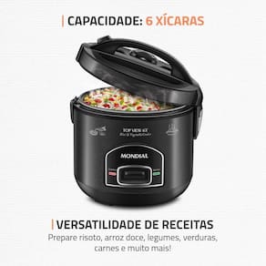 A Panela Elétrica Top View 6X Mondial prepara até 6 xícaras com praticidade. A tampa com visor transparente permite ver o cozimento em tempo real e ainda valoriza o design com um acabamento moderno. Versátil, faz diferentes tipos de arroz e ainda permite criar receitas com legumes, verduras e carnes. A cuba antiaderente removível facilita a limpeza, enquanto a função aquecer mantém o arroz quentinho por horas. Com 1 ano de garantia Mondial, é uma escolha segura e eficiente para a rotina na cozinha. Saiba mais sobre a PE-30-6X da Mondial: