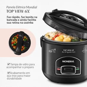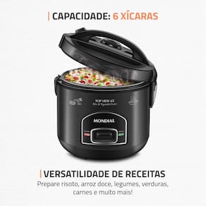 Tampa com visor transparente, Cuba antiaderente removível, Função aquecer, Acompanha cesto Cozi Vapor, Coletor de vapor, Acompanha colher e copo medidor., Tampa com visor transparente, Cuba antiaderente removível, Função aquecer, Acompanha cesto Cozi Vapor, Coletor de vapor, Acompanha colher e copo medidor.Lâmpada piloto